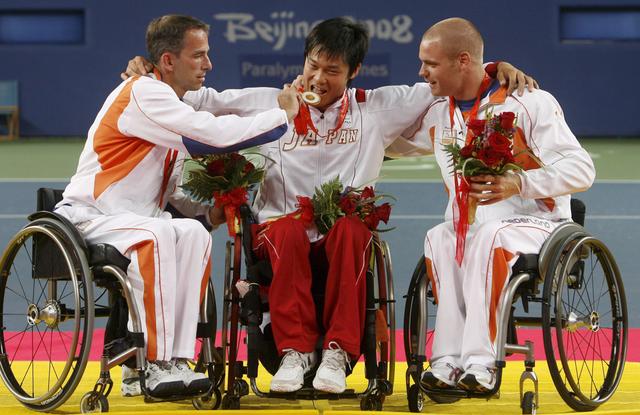 Robin Amerlaan, Shingo Kunieda et Maikel Scheffers, Pékin 2008 (photo DR)