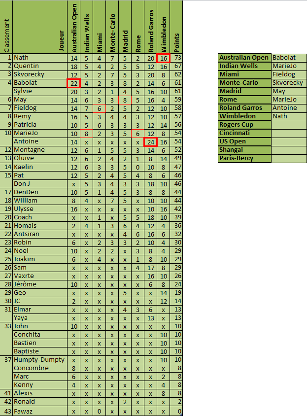 Restent les meilleurs : Nath, Quentin, Antoine et Ulysse. 16 points, c’est faible par rapport à l’Australie et Roland-Garros mais c’est une excellent score pour un tournoi assez dingue.
