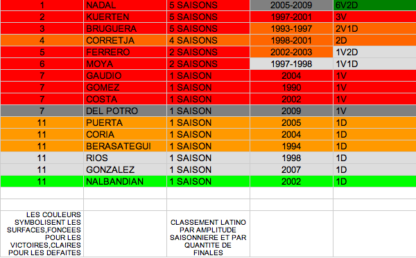 Pour en revenir au fond, quand on regarde de plus près le tableau, on s’aperçoit quand même qu’il serait judicieux de distinguer les espagnols d’un côté et les sud-américains de l’autre en ce qui concerne la longévité. En effet seul Kuerten arrive à s’immiscer parmi les 5 premiers espagnols.