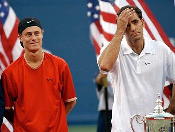 A l’instar d’Hercule nettoyant les écuries d’Augias, Pete Sampras fait littéralement le ménage dans le tableau de l’US Open 2001, éliminant successivement les vainqueurs de 1997 – 1998 (Rafter, 6/3 6/2 6/7 6/4), 1999 (Agassi, 6/7 7/6 7/6 7/6) et 2000 (Safin, 6/3 7/6 6/3). Las, complètement épuisé par son parcours du combattant, « Pistol Pete » ne tiendra qu’un set face à la teigne australienne, Lleyton Hewitt, avant de s’écrouler physiquement pour ne marquer que deux petits jeux dans les deux derniers sets.
