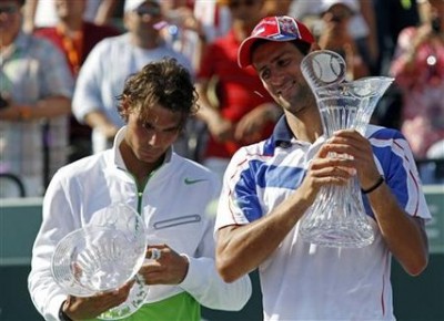 Rencontre qui ne tarde pas à survenir puisque c’est dès le tournoi de Miami que le numéro 1 officiel et le numéro 2 officieux se retrouvent. Sur cette surface dure qui a perdu de sa fulgurance, le combat éclate pourtant et c’est à nouveau Nadal qui gagne la première manche. Exacte réplique de leur duel à Indian Wells, le deuxième set revient à Djokovic. C’est en véritable lutte à main nue que la manche décisive débute. Les coups font mal, les intentions encore plus. Les regards ne trompent pas. Nadal veut calmer les ardeurs de ce Djokovic qu’il ne reconnaît pourtant déjà plus. La sentence tombe : ce sera un jeu décisif. On pense alors que Nadal étouffera l’affaire comme il le fait toujours, qu’il saura temporiser le temps des premiers points avant d’exécuter sa proie d’une gifle de coup droit décroisé. Nadal, perdre un match au couteau ? Et pourquoi pas un Petit chelem de Djokovic ! Mais le Serbe défie les statistiques et mystifie son adversaire, qui finira, fait rarissime, la rencontre assis sur le banc en essayant de reprendre son souffle. Djokovic a battu Nadal à son propre jeu. Il venge sa demi-finale de 2009 à Madrid et continue d’engranger de la confiance. Du côté espagnol, c’est tout l’inverse qui se produit. Cette petite désillusion fera dire à Nadal qu’il ne voit pas comment Novak ne pourrait pas devenir numéro 1 mondial. Terrible aveu de faiblesse, et étonnante déclaration de la part du combattant Nadal. Le « Djoker » aurait-il entamé la carapace espagnole ? Tant pis, l’ogre se rassasiera bientôt, la saison de terre battue approche…