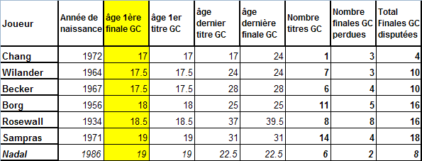 B / Ceux qui émergent dans la norme : premier titre ou première finale entre 20 et 22 ans bien frappés.