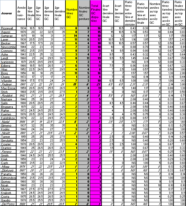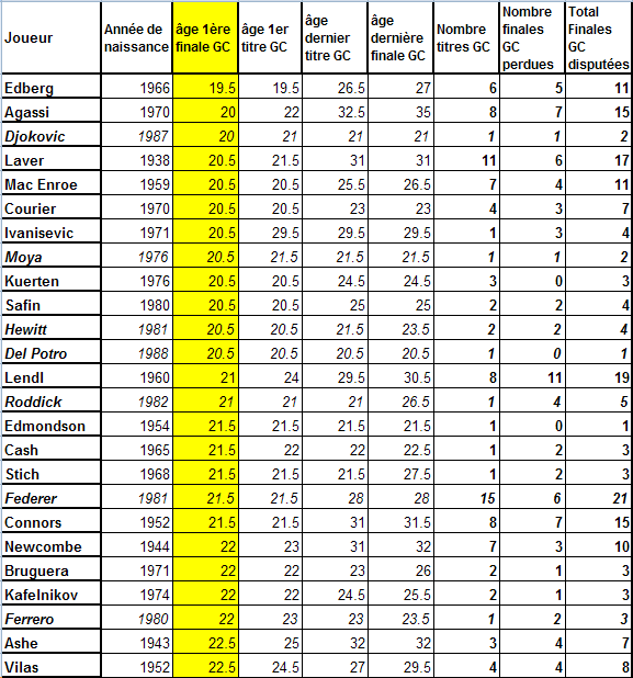 Mis à part les deux cas tout à fait hors normes de Rosewall et Agassi, globalement, il n’est guère surprenant de voir qu’une forte majorité des 48 champions recensés ne brille pas au delà de 28 ans.