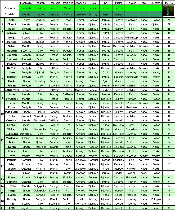 Pour tout le monde sauf Fred : Houston va être décisif, les pronos divergent, et les places vont changer, sauf en cas de victoire d’un no-name. Monte-Carlo et Barcelone souriront aux audacieux ayant misé sur Djoko et Ferrer, mais ne seront certainement pas décisifs dans la victoire finale… Vivement Eastbourne que les vrais connaisseurs sortent du lot !
