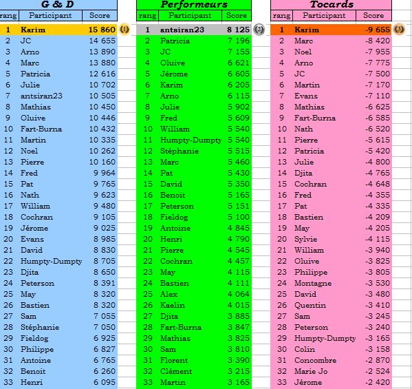 Mais avant d’en venir à ces participants, il convient de saluer le Deuxième Prix obtenu par antsiran23 qui vient récompenser celui qui aura obtenu le meilleur résultat dans la catégorie Performeur. Ce dernier devance Patricia de près de 1 000 points, laquelle devance JC de quelques points. Au classement général, JC est d’ailleurs deuxième, ayant obtenu également une cinquième place chez les Tocards. Arno est 3e au classement général grâce à une quatrième place chez les Tocards et une septième chez les Performeurs. Marc est deuxième chez les Tocards mais seulement treizième chez les performeurs, de sorte qu’il n’est que quatrième au classement général. Il est suivi par Patricia qui est pénalisée par le fait qu’elle n’est que douzième chez les Tocards.