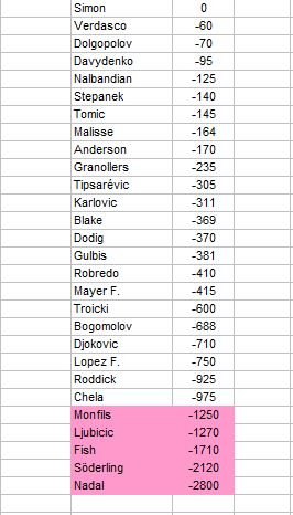 Concernant les résultats, j’ai effectivement un écart sur les tocards (Je ne sais pas si c’est dû exclusivement à Tsonga vu que j’ai pris le train en route) mais aucun sur les performeurs. J’ai l’impression que la perte de points de Nadal a été sous-évaluée, à l’inverse de celle de Fish…