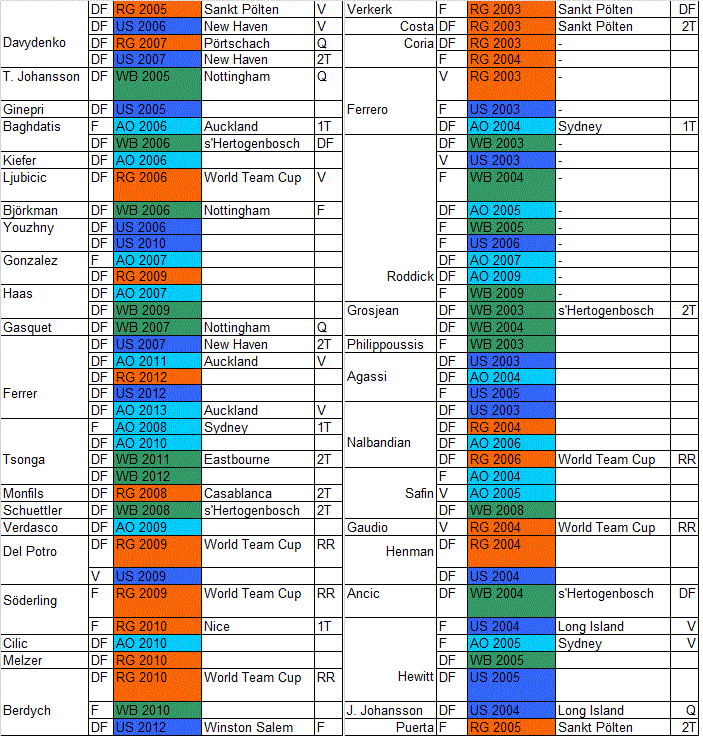 Très bonne idée Skvo ! L’analyse que j’en tire, c’est que les one shot font en général un petit tournoi avant de perfer en GC. Cela ne se vérifie pas toujours bien sûr, mais quand on regarde à Roddick par exemple, on voit qu’il n’a jamais fait de tournoi préparatoire avant d’enchaîner sur une demi-finale.