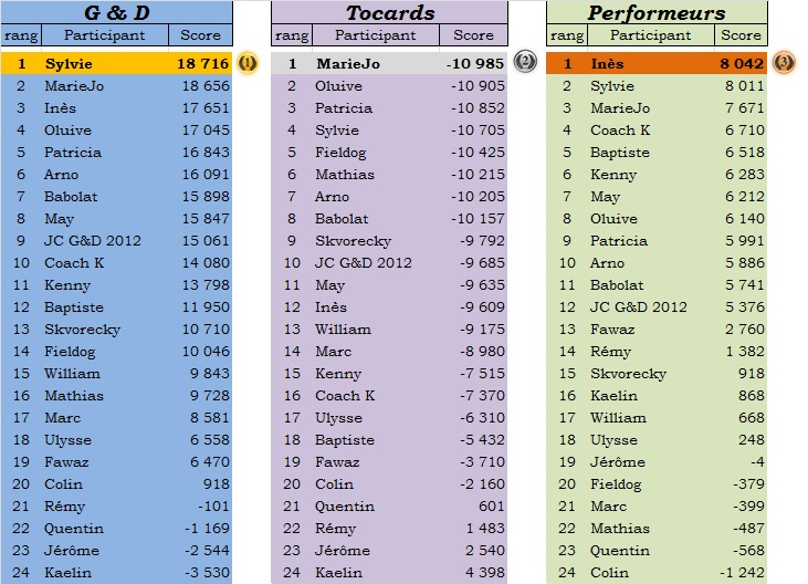 Quant au reste du monde, seul un participant masculin arrive à s’immiscer entre deux filles au classement des tocards et il s’agit d’Oluive. Nous sommes passés de peu à côté de 3 tiercés féminins sur les 3 critères du jeu : « G&D ; Tocards & Performeurs ».