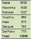 Sans surprise c’est Nadal qui est numéro 1 des performeurs puisqu’il double ses points acquis en 2012 . Wawrinka et Robredo signent aussi une belle performance. On remarque la présence de Gasquet parmi les sept premiers collecteurs de points cette année.