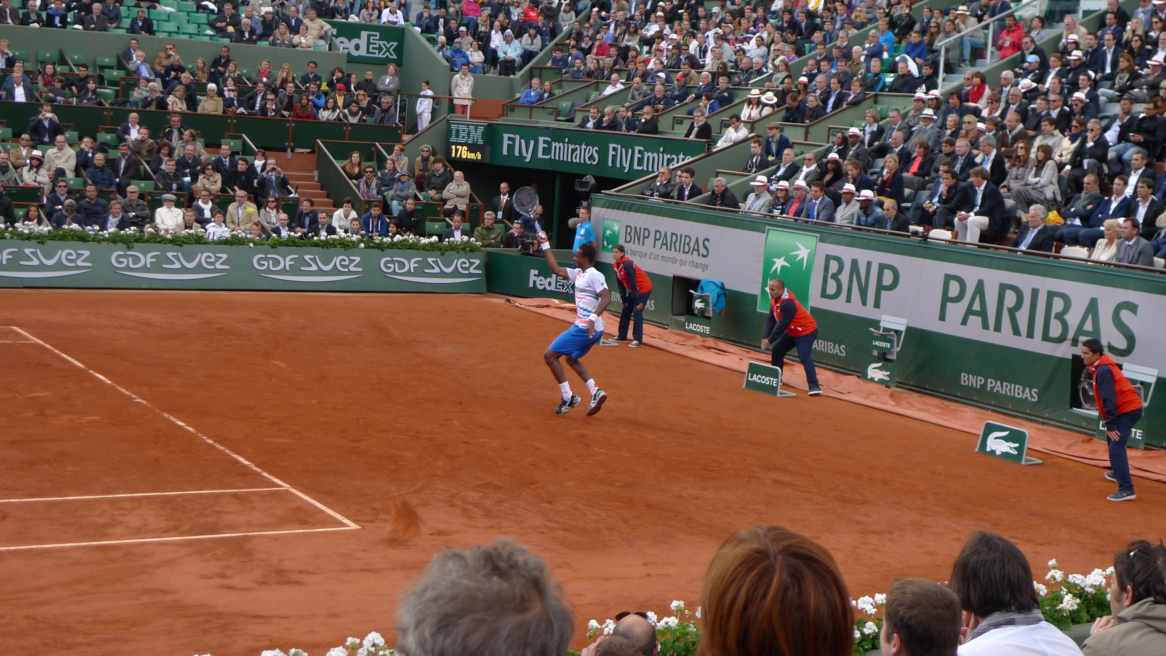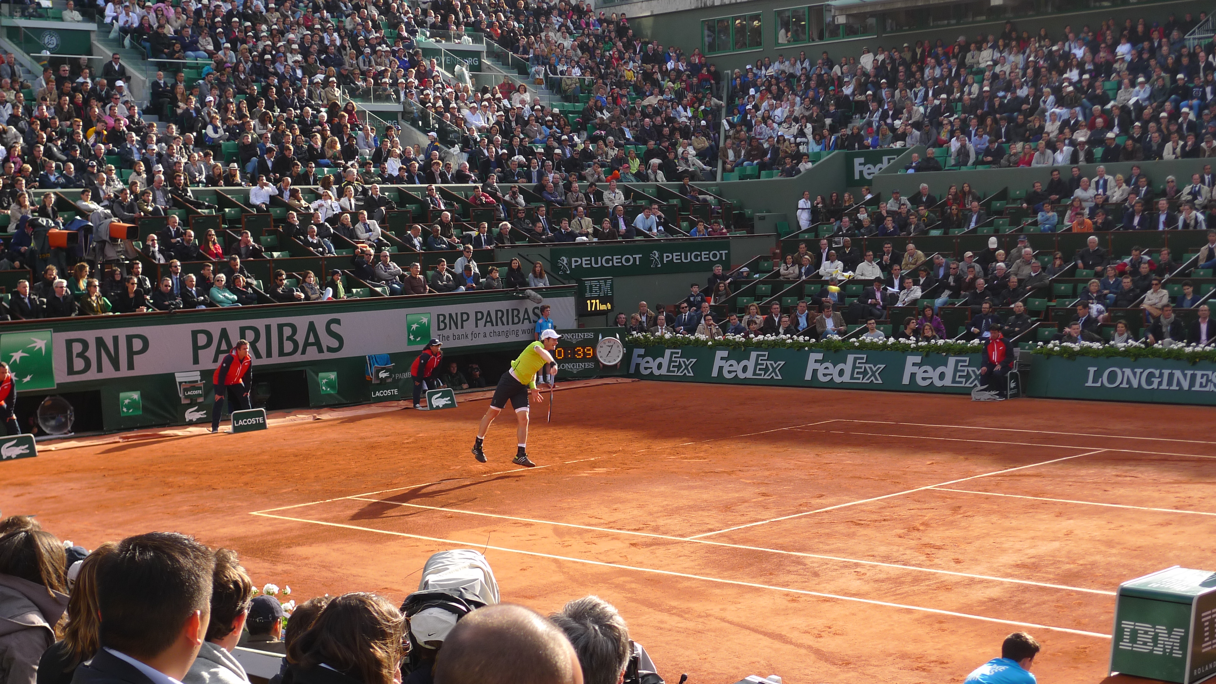 Sur l’écran géant qui fait Pschhiiiit tous les deux jeux, le bruit d’un can de Perrier gigantesque qu’on ouvre, je vois que sur le Lenglen, elles en ont terminé aussi et que les deux quarts masculins vont donc commencer presque en même temps. A 18h15, entrée dans l’arène d’Andy, puis de Gaël. Andy ne s’est pas trompé, ce sera une ambiance de Coupe Davis… Il doit être 18h25 quand le match débute, cela laisse donc trois bonnes heures pour jouer s’il ne pleut pas, une chance que les deux quarts se terminent donc à temps.