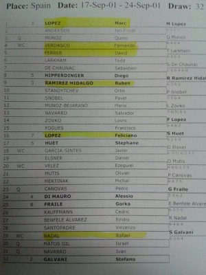 Les joueurs inscrits au tournoi sont venus par délégations. En dehors des locaux qui occupent plus de la moitié du tableau, on trouve des Néerlandais, des Français, des Italiens. Soyons honnêtes, je ne connais pas grand monde. Mais les spectateurs sont parfois chanceux : lors de l’édition 2001, ils avaient pu voir évoluer un futur grand tel que Rubén Ramírez-Hidalgo, ainsi que d’autres jeunes un peu moins connus, comme on peut le constater sur le tableau…
