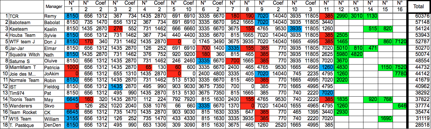En queue de classement, la W15 Team est toujours en mauvaise posture, mais c’est surtout le Manager DenDen qui doit fulminer dans les vestiaires devant la nullité des joueurs engagés durant le mercato.
