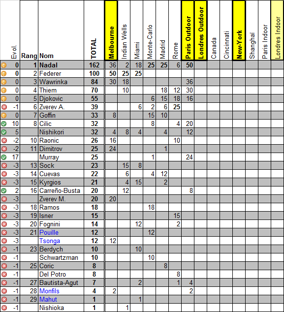 Rappelons que 14 Grands prix sont disputés cette année, dont 4 «super grands prix» (Melbourne, Paris-outdoor, Londres-outdoor et New-York) qui apportent deux fois plus de points qu’un GP classique, et un «masters GP» indoor qui clôture l’année (réservé aux huit meilleurs cogneurs de la saison, ce dernier rapporte 50% de points en plus qu’un GP classique; il sera disputé cette année, comme lors des huit éditions précédentes, à Londres).