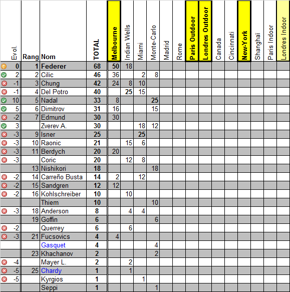 Rappelons que 14 Grands prix sont disputés cette année, dont 4 «super grands prix» (Melbourne, Paris-outdoor, Londres-outdoor et New-York) qui apportent deux fois plus de points qu’un GP classique, et un «masters GP» indoor qui clôture l’année (réservé aux huit meilleurs cogneurs de la saison, ce dernier rapporte 50% de points en plus qu’un GP classique; il sera disputé cette année, comme lors des neuf éditions précédentes, à Londres).