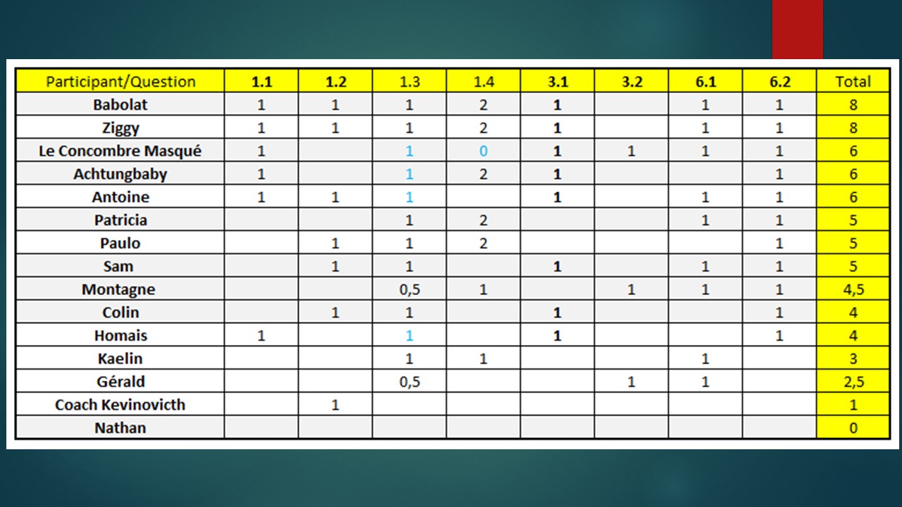 Pour les points ajoutés: 2 points pour les personnes qui avaient vu Djoko gagner un GC, un point pour ceux qui avaient simplement répondu oui au fait qu’un membre du trio Djoko-Murray-Wawrinka remporterait un GC. Le Concombre Masqué a un zéro un bleu car son pronostic que 2 des membres de ce trio remportent un GC est encore possible.