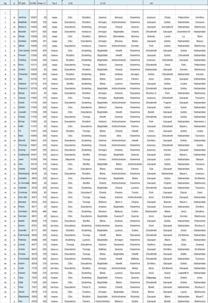En attendant qu’Ulysse sorte de sa cachette pour cette mise à jour si attendue, les filles lui volent la vedette (May pour la mise à jour du fichier, et Marie Jo pour la mise en ligne ) ! Voici la mise à jour de l’Odyssée après Roland-Garros… eh oui vous ne rêvez pas ! La mise à jour post-Wimbledon, avec prise en compte des changements d’équipes, sera si tout va bien en ligne dans le courant de la semaine prochaine (Ulysse help us !!!).