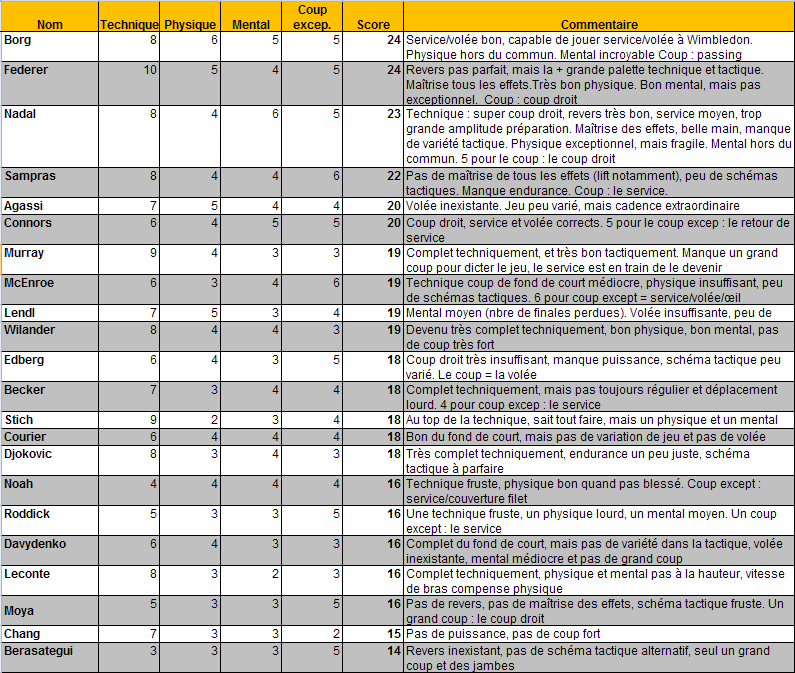 Je me suis livré à un petit exercice consistant à attribuer un certain nombre de points à un échantillon de grands joueurs que j’ai vu évoluer (à ce titre, je n’ai pas mis Laver, mais tous ceux qui l’ont vu jouer ont mis en évidence le fait que c’était un joueur techniquement complet).