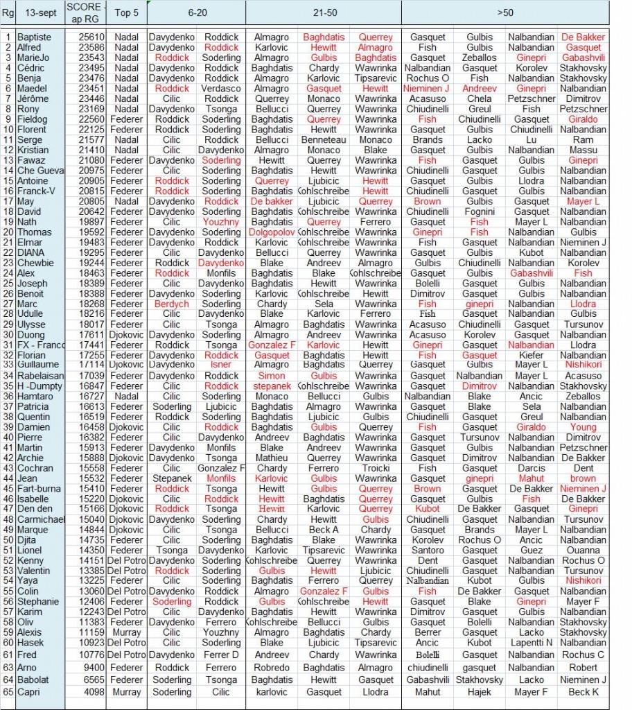 Reste maintenant à fignoler les positions. Si Baptiste a pris une avance conséquente devant, ils sont encore une demi-douzaine à pouvoir prétendre à la victoire finale. Et puis il y a tous les accessits : meilleur Fédérien, meilleur Djokoviste, sans oublier la course à la lanterne rouge…