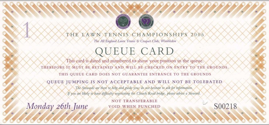 Alors, je ne sais plus vraiment lequel d’entre nous pris une décision qui s’avérera décisive : il nous faut escalader la grille dont la porte est fermée. D’une hauteur de trois mètres et bardée de pique, celle-ci n’a pas décidé de nous faciliter la tâche. Toujours est-il que nous y parvenons. Cette fois, nous avons retrouvé la lumière des lampadaires d’une rue… mais nous ne savons pas vraiment où nous sommes. Notre sens de l’orientation aiguisé nous pousse vers la légère montée sur la droite et… nous arrivons vers la south queue ! Nous n’avons aucune idée d’où commence cette queue et ne voulons pas le savoir. Nous nous asseyons à même le trottoir, contre le petit muret, derrière une tente habitée par trois jeunes Français. Et nous ne bougerons plus d’un pouce de la nuit. Il doit être quelque chose comme 23h lorsqu’un officiel de Wimbledon passe vers nous et nous tend de précieux sésames : une queue card ! Celui-ci ne nous garantit pas nos places pour le lendemain, mais au moins désormais nous ne pourrons pas être dépassés par d’autres personnes. De plus, l’officiel semble assez optimiste quant à nos chances.