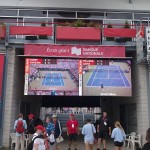 Les essais des samedi et dimanche sont ouverts gratuitement au public. Même s’il y a un peu de monde quand nous y arrivons vers 10h, cela ne suffit pas pour autant à remplir le stade, loin s’en faut. Deux écrans nous annoncent le programme en cours : sur le Central, Lukasz Kubot (67e mondial et récent héros du Super GP de Wimbledon qu’il a fini à la 7e place) affronte un jeune Canadien titulaire d’une wild-card, Erik Chvojka, 456e mondial. [Cliquez sur les photos pour les voir en pleine résolution].
