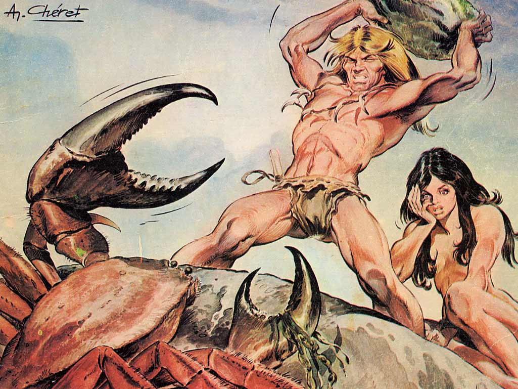 Rahan prêt à écraser un crabe. Faut-il y voir un signe ? Mais c’est un coriace un crabe…