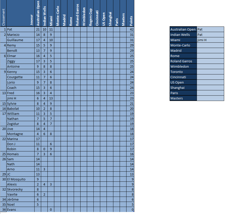 Merci Rémy pour m’avoir accordé, avec la plus parfaite exactitude, 7 points pour ce tournoi de Miami. Quand Rémy compte juste, il faut le faire savoir, les gens étant parfois si prompts à colporter des rumeurs aussi désagréables qu’infondées. Je suis très content de mon chiffre 7, magique, et qui annonce des lendemains qui chantent. Je suis ravi de partager aussi la 17ème place avec William. C’est un honneur.
