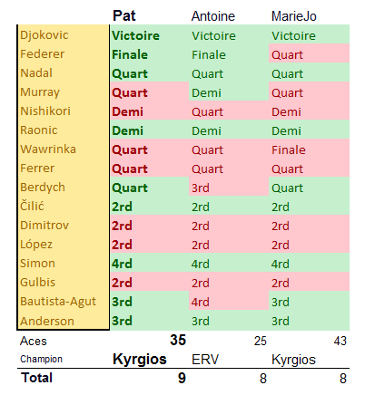 Pat s’impose d’un petit point devant Antoine et MarieJo afin de prolonger son début d’année fantastique. Un RYSC assez homogène, avec une victoire attendue du Djoker et une élimination prématurée de Nadal finalement assez prévisible.
