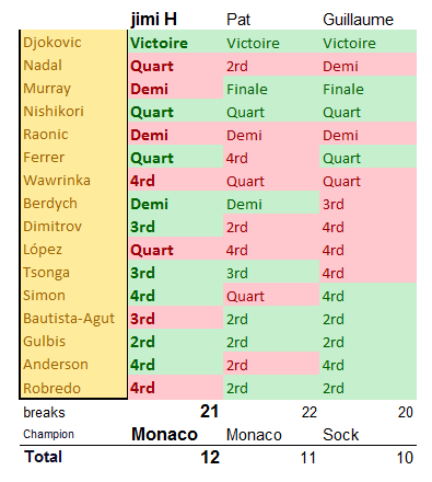 Querrey m’a trahi en ne concluant pas alors qu’il servait pour le match (pas de chance) et Simon-Ferrer intervertis pour deux points (grosse erreur de ma part, Ferrer gagne le plus souvent !).