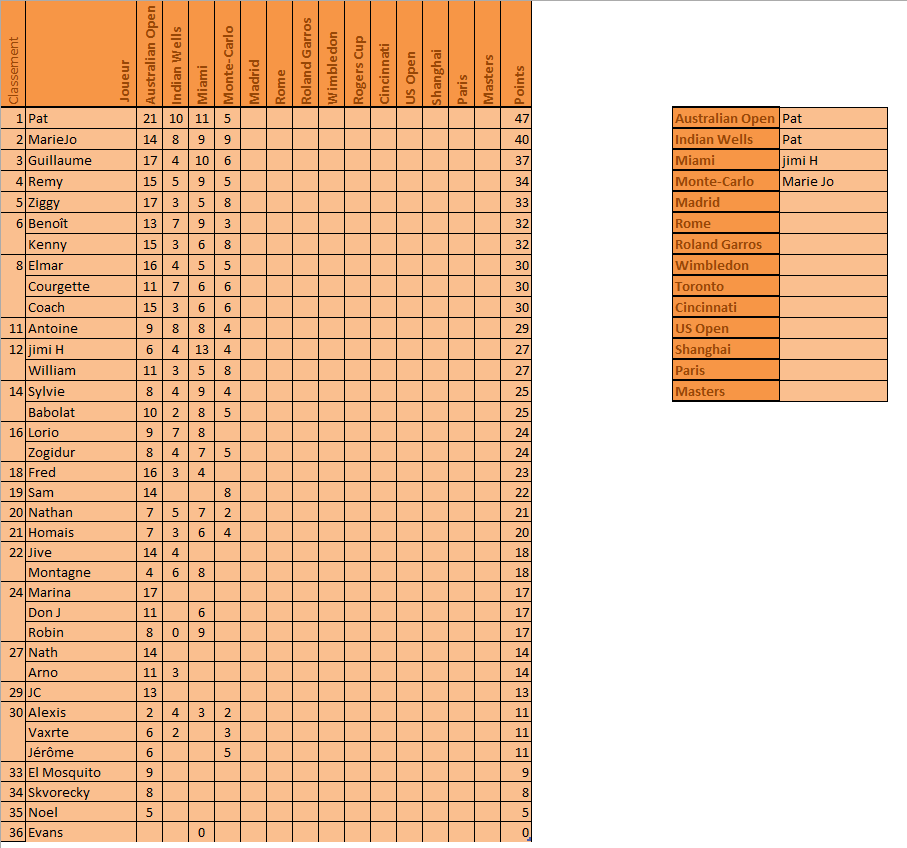 La baisse de régime de Pat est toute relative et seule MarieJo en profite. Nous approchons de la fin du premier tiers de l’année et déjà ces deux-là semblent intouchables. Voici les résultats en détails.