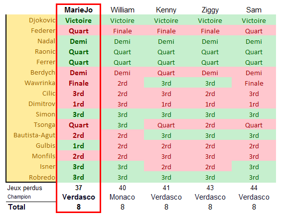 5 personnes finissent le tournoi avec 8 points en poche, le résultat final se joue donc à la question subsidiaire. A ce petit jeu, Marie Jo grille les 4 autres sur le fil pour la victoire finale.