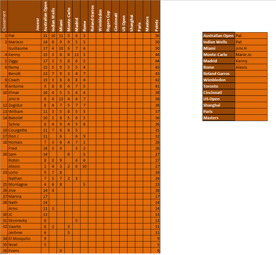 De plus, vous êtes tous impatients de connaitre les résultats des tournois de Madrid et Rome. C’est donc le bon moment pour communiquer les résultats à jour à la veille du second Grand chelem de la saison.