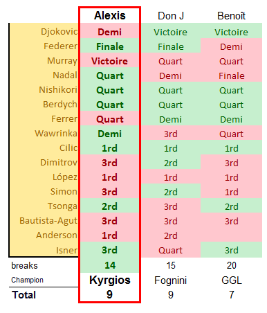 14 breaks pour victoire (oui encore) de Djokovic. Presque tout le monde l’attendait. Don J avait la finale et les vainqueurs mais c’est bien Alexis qui s’impose en répondant parfaitement juste à la question subsidiaire.