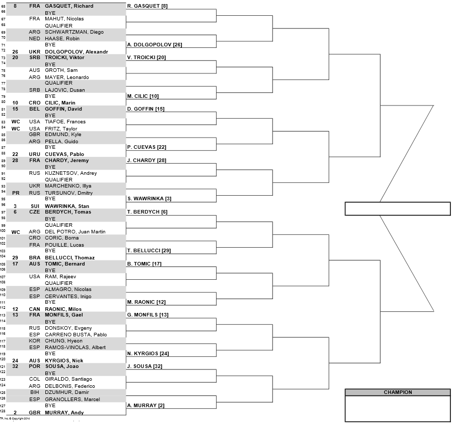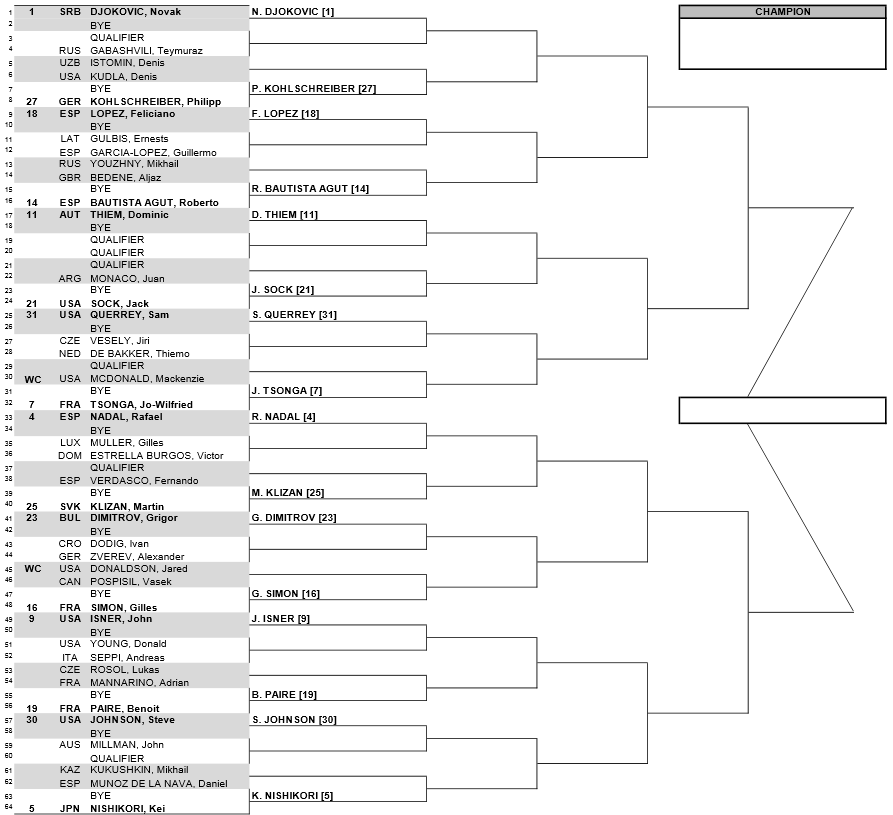 Liste des joueurs têtes de série : Djokovic, Murray, Wawrinka, Nadal, Nishikori, Berdych, Tsonga, Gasquet, Isner, Cilic, Thiem, Raonic, Monfils, Bautista Agut, Goffin, Simon, Tomic, Lopez, Paire, Troicki, Sock, Cuevas, Dimitrov, Kyrgios, Klizan, Dolgopolov, Kohlschreibern Chardy, Belluci, Johnson, Querrey et Sousa.