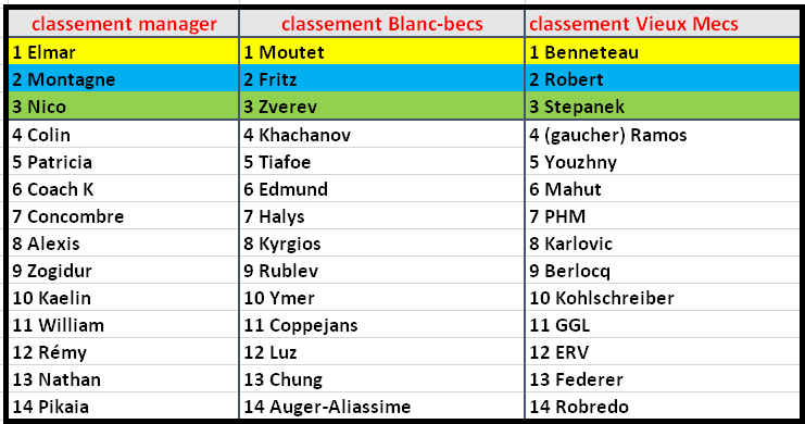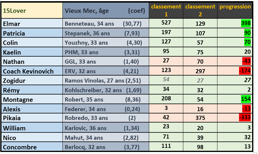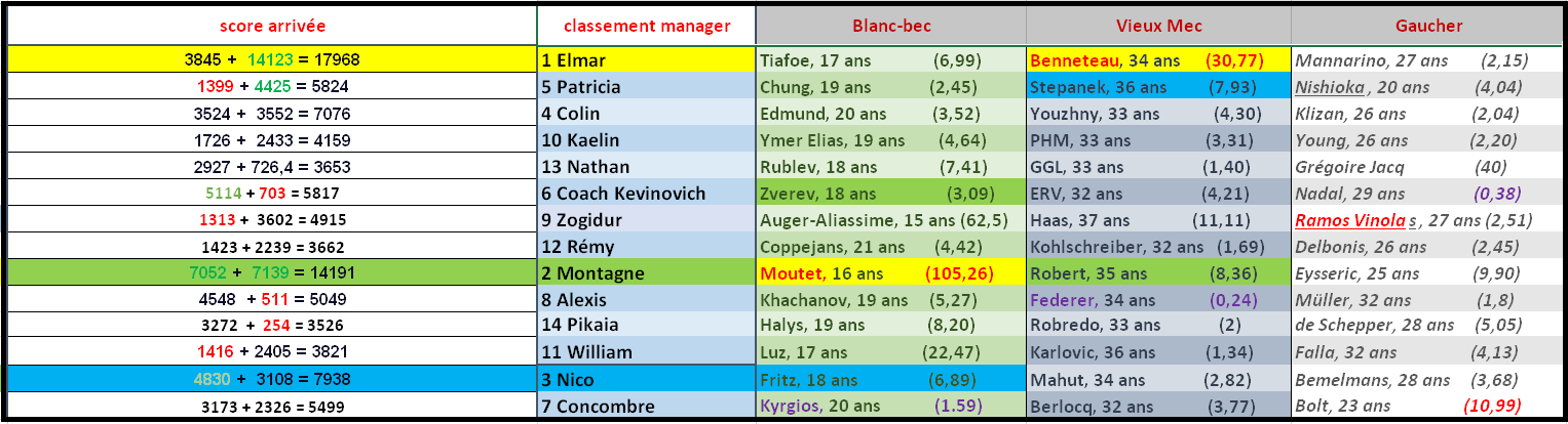 Je pense que Rublev devrait te faire échapper à la lanterne rouge, William et Rémy (leurs vieux mecs Karlovic et Kohli ont un coef négligeable et ont a peu près stagné, alors que leurs jeunots ont notablement régressé)…