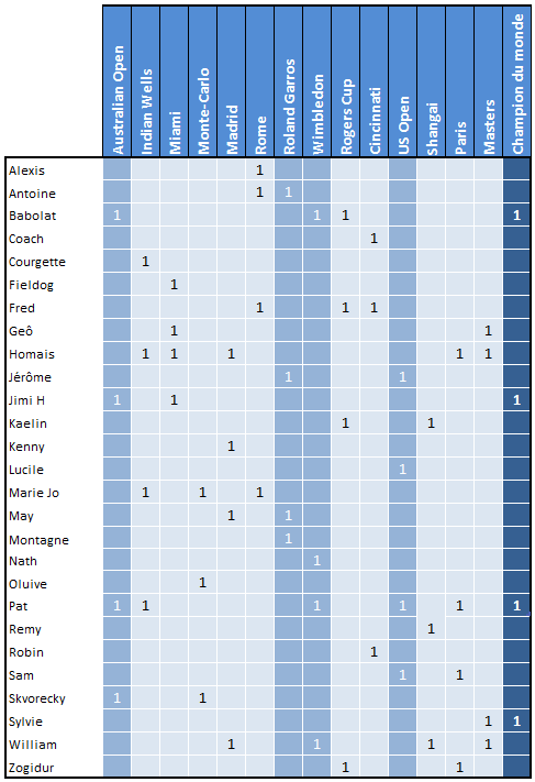 L’année 2017 est effectivement très alléchante Patricia, pleine d’incertitudes et de vainqueurs potentiels, sauf si Murray sur sa lancée prend l’ascendant sur Djoko. Mais je le vois mal ultradominer avec Fed, Del Potro dans les parages.