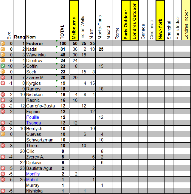 Rappelons que 14 Grands prix sont disputés cette année, dont 4 «super grands prix» (Melbourne, Paris-outdoor, Londres-outdoor et New-York) qui apportent deux fois plus de points qu’un GP classique, et un «masters GP» indoor qui clôture l’année (réservé aux huit meilleurs cogneurs de la saison, ce dernier rapporte 50% de points en plus qu’un GP classique; il sera disputé cette année, comme lors des huit éditions précédentes, à Londres).