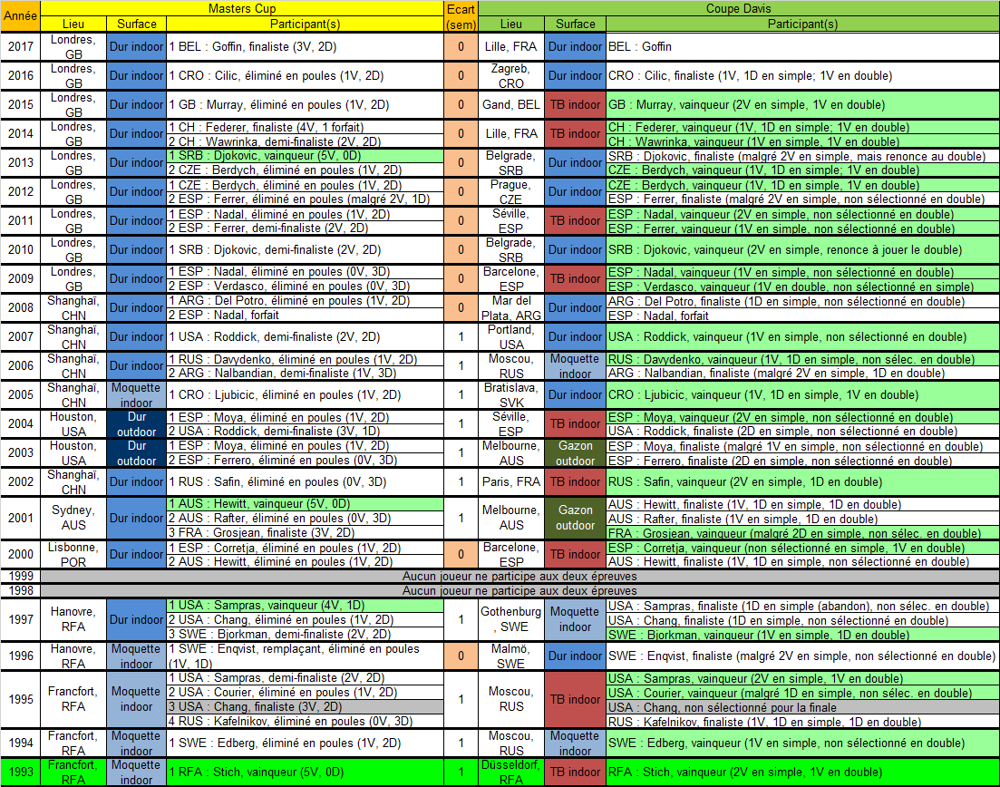 En fait, bien souvent, les vainqueurs de Coupe Davis se retrouvent parmi les joueurs éliminés précocement à la Masters Cup : 11 cas ces 24 dernières années de vainqueurs de Coupe Davis qui étaient sortis des Masters dès les poules (le plus récent étant Andy Murray en 2015), contre 5 cas de demi-finalistes, et donc deux finalistes dont on vient de parler.