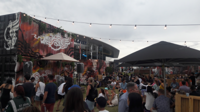 En entrant, dans un premier temps, je ne constate pas d’énorme différence avec le grand chelem parisien. On voit au loin les 3 grosses enceintes, il y a des courts annexes un peu partout, il y a du monde dans les allées, bref, du connu. Sauf que ce n’est que la partie immergée de l’iceberg ! Un peu plus loin, il y a une grande esplanade où on trouve un peu de tout (mais pas grand-chose à voir avec le tennis) : des aires de jeu pour enfants, des stands de nourriture de tout type, des stands de boissons (y compris de la vraie bière), des concerts, des poufs pour confortablement regarder les écrans géants disposés un peu partout ; on se croit dans un festival de musique, sauf qu’à quelques mètres de là il y a des gens qui jouent au tennis. Apparemment, les Australiens viennent là pas forcément pour regarder du tennis, mais juste pour passer un bon moment en famille ou entre amis. Évidemment, on trouve aussi les classiques boutiques de souvenirs, dans laquelle j’ai acheté ma casquette souvenir (qui allait me servir pour survivre au soleil du samedi) ainsi qu’un pin’s pour ma collection.