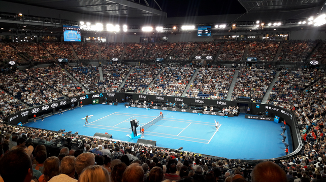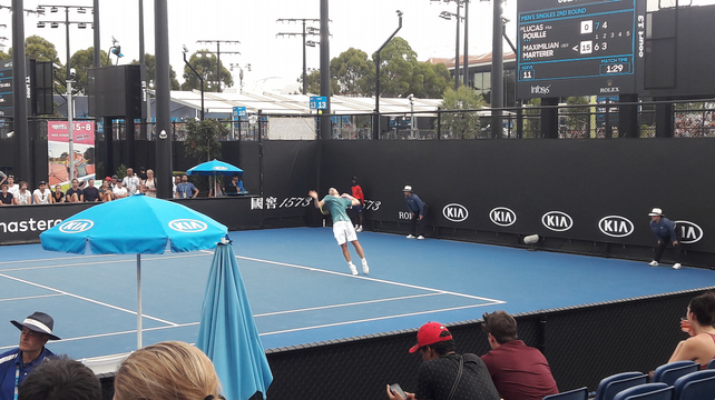 L’entrée sur la Rod Laver Arena pour les night sessions est prévue à 19h30, nous avons donc un peu de temps pour aller voir quelques échanges sur les courts annexes. Nous regardons sur les très nombreux écrans de score quel terrain pourrait nous intéresser et nous voyons un petit Gillou contre un local, Alex Bolt, sur le court n°3 ; un court un peu plus grand que les courts annexes standards, tout décoré de tags. Malheureusement, comme un Australien est sur le terrain, il y a la queue pour rentrer et nous décidons de tenter notre chance ailleurs, et nous voyons que Lucas Pouille est en train de jouer son 2ème tour contre Maximilien Marterer sur le très annexe court 13. J’ai été étonné de la proximité de ces courts avec l’allée où circule le public : on est à 2 m des joueurs et il n’y a pas de grillage. Dans la tribune, nous trouvons sans mal des places pour nous asseoir, et nous encourageons Lucas qui n’en a pas trop besoin, bien qu’il fasse de très nombreuses fautes en longueur. Ça joue vite, mais de manière très monotone, sans variations ou montées au filet.