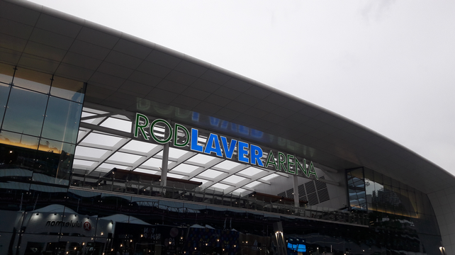 Entrée sur la Rod Laver : pour ceux à qui ça parle, l’accès aux gradins fait beaucoup plus penser au POPB qu’au Chatrier. On est à l’intérieur, ça fait un grand cercle avec des portes numérotées, plein de toilettes et de boutiques dans l’allée, bref, on n’a pas l’impression d’être dans un tournoi outdoor. L’impression est d’ailleurs pas complètement effacée quand je rentre, puisque la moitié du toit est sortie. Ce qui frappe ensuite c’est la taille du stade, qui est un cran au dessus des arènes parisiennes (mais pas non plus de manière incroyable).