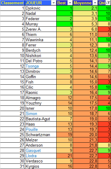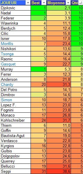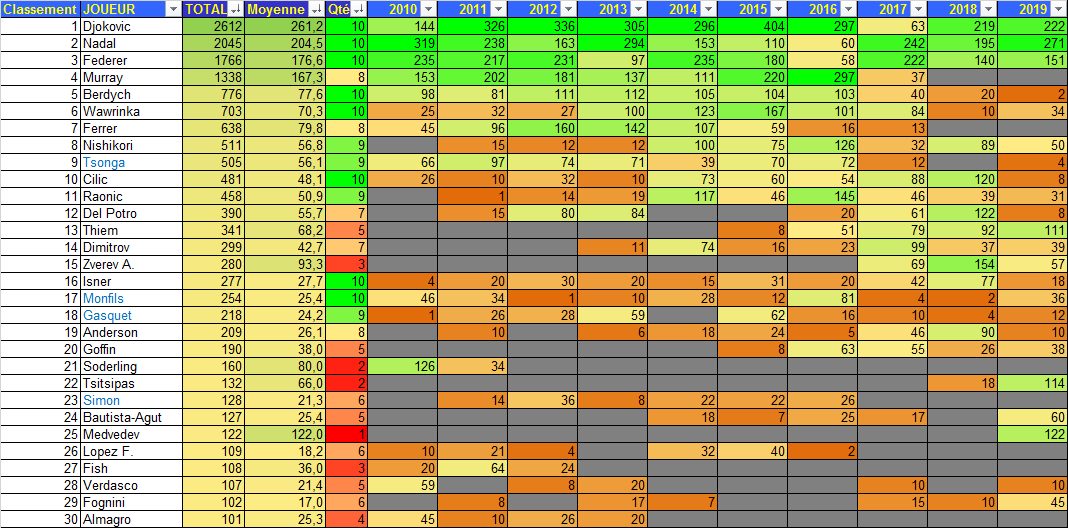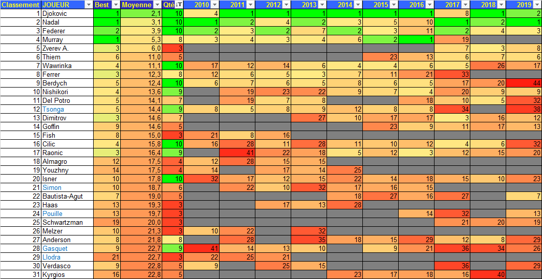 Ils sont 33 à avoir été classés au moins 5 fois (voir tableau ci-contre). On voit dans ce tableau qu’à part les trois monstres (dont le classement moyen sur la décennie est inférieur à 4), les autres joueurs à avoir toujours été classés (mais tous avec un classement moyen supérieur à 10…) sont Wawrinka, Berdych, Cilic, Isner et… notre Gaël national.