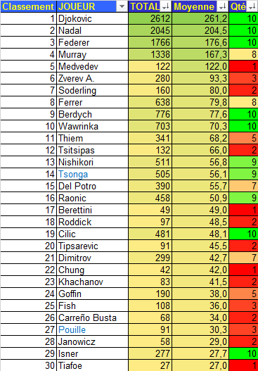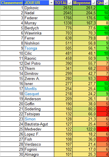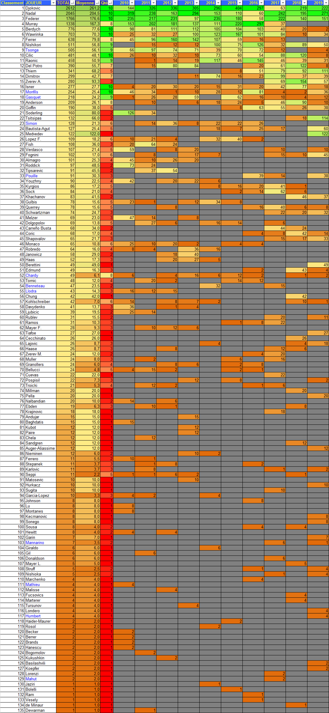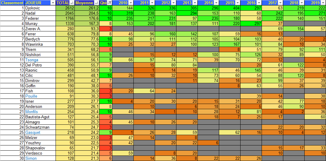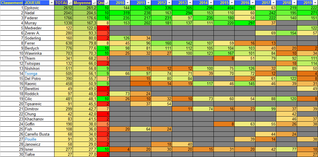 En étant encore plus restrictif, c’est à dire en se limitant cette fois aux joueurs ayant été classés au moins 5 fois, voici le top 30 de la décennie. Exit Zverev, Haas, Pouille, Llodra… Mais welcome back Monfils et Chardy :