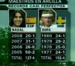 La domination absolue exercée par Rafael Nadal sur terre battue (97,3% de victoires) depuis sa défaite contre Andreev à Valence en 2005 (pour rappel, quatre matchs perdus dont deux contre Federer à Hambourg 2007 et Madrid 2009, ainsi qu’un contre Ferrero à Rome 2008 pour cause d’ampoules au pied et un contre Soderling à Roland-Garros 2009) et la sévérité des défaites infligées, rappellent la période 1974-1981, durant laquelle un autre grand champion a, comme lui, dominé de la tête et des épaules le tennis sur la surface ocre : Bjorn Borg.
