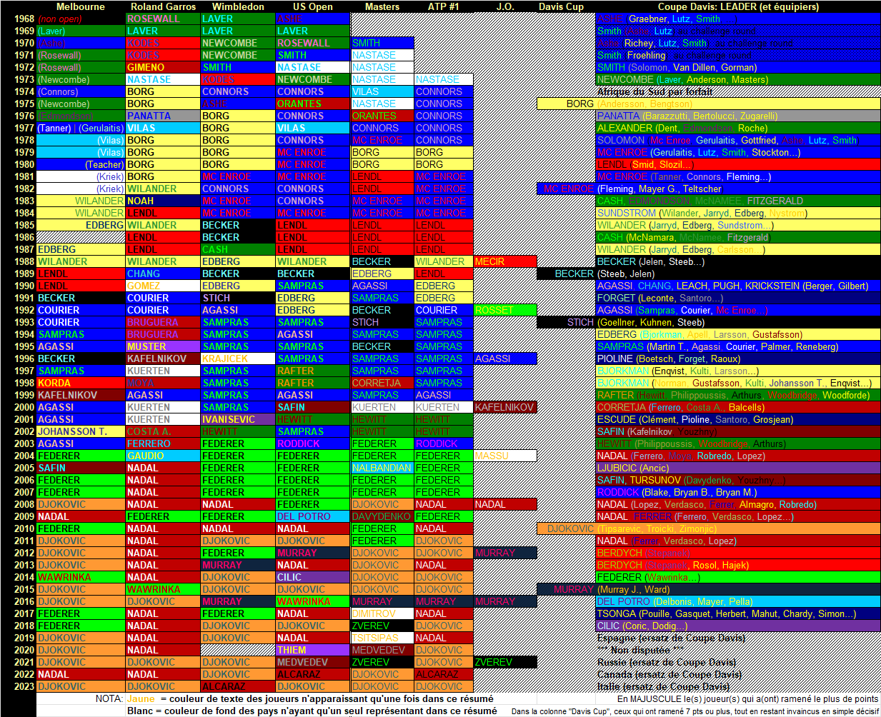 Synthèse des vainqueurs en Grands chelems, Masters, J.O., Coupe Davis et des « year-end n° 1 » ATP depuis le début de l’ère Open